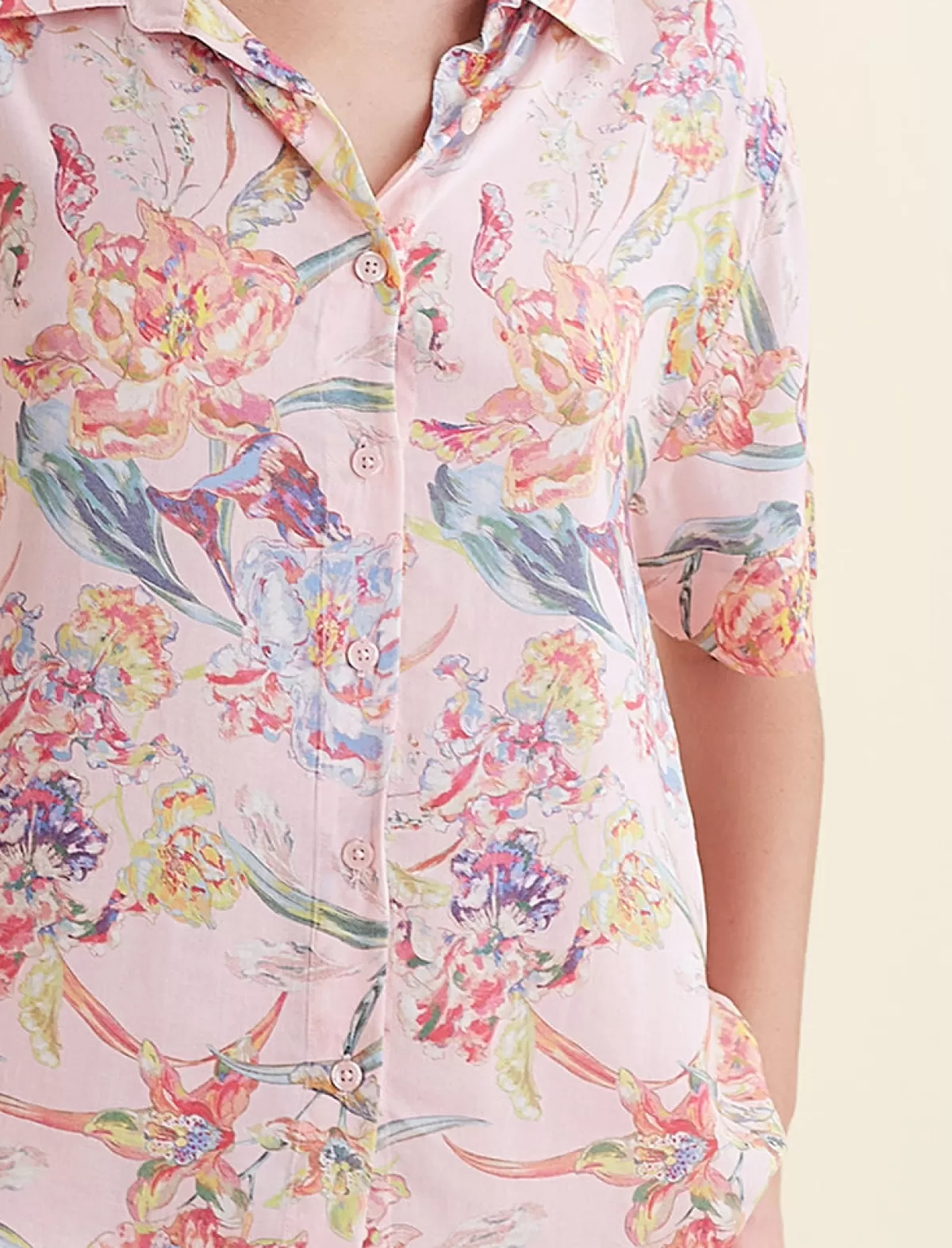 • 100% Lenzing™ Ecovero™ Viscose • Woven, breathable fabric • Relaxed fit, creating a lovely drape • Button down shirt front • Short sleeves • Fabric covered buttons • Pair me with my matching full length pants or shorts!