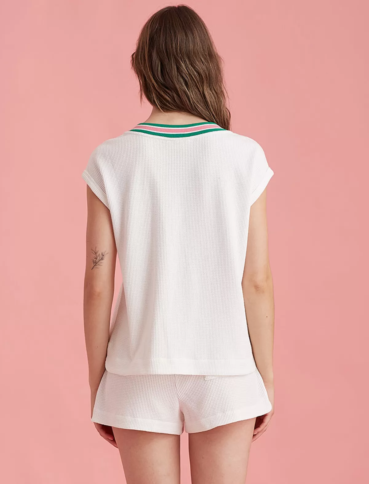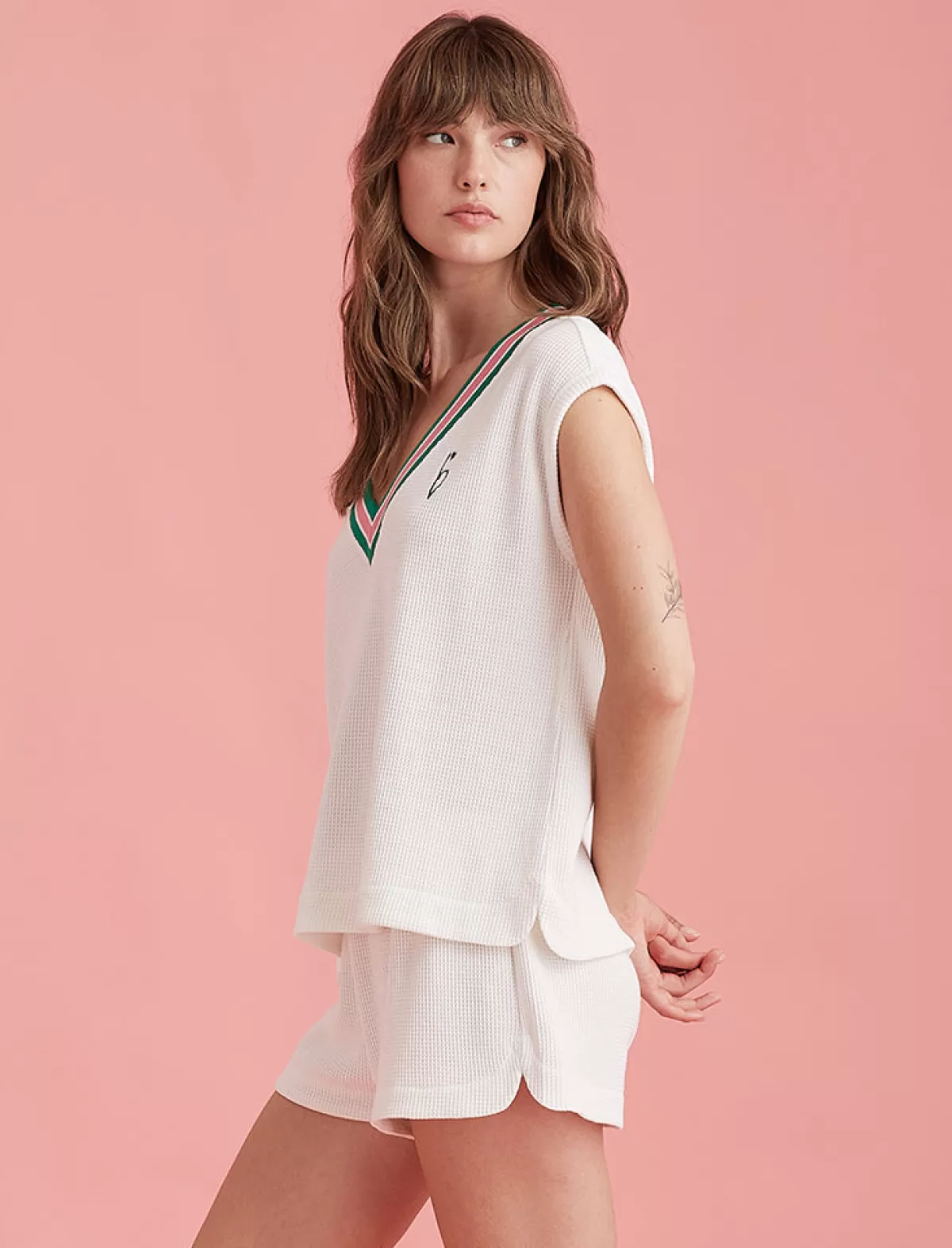 Papinelle x besties bring you a limited edition collaboration. A tennis-inspired sleepwear range designed in contemporary styles whilst embracing a nod to the 70’s. It is designed to take you from the bedroom to the centre court.