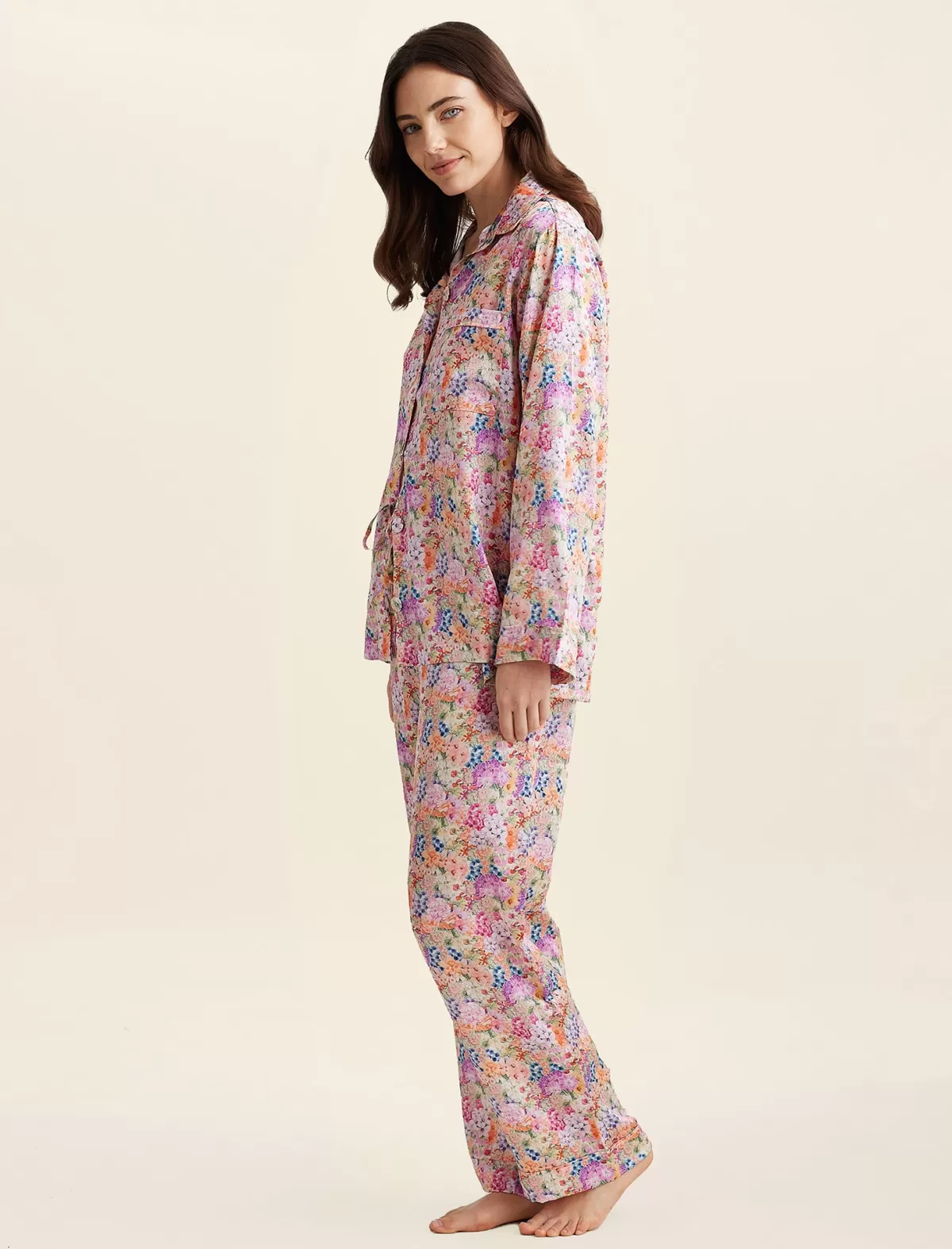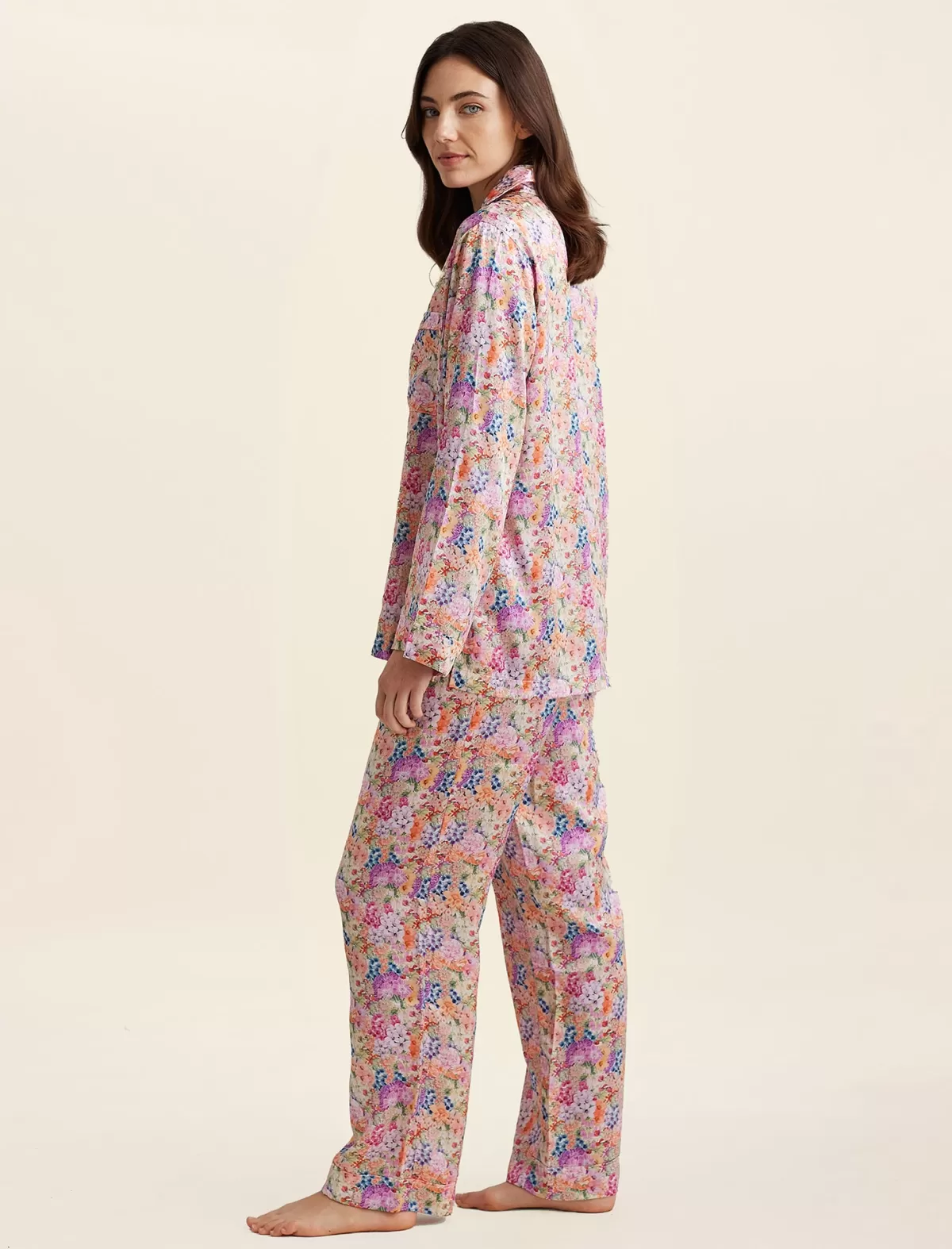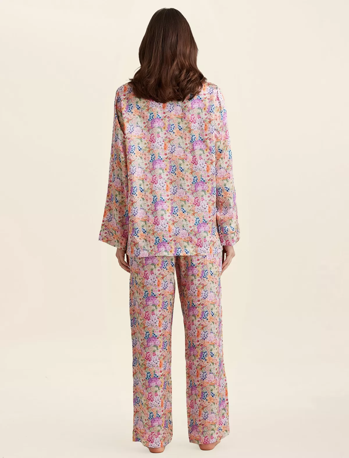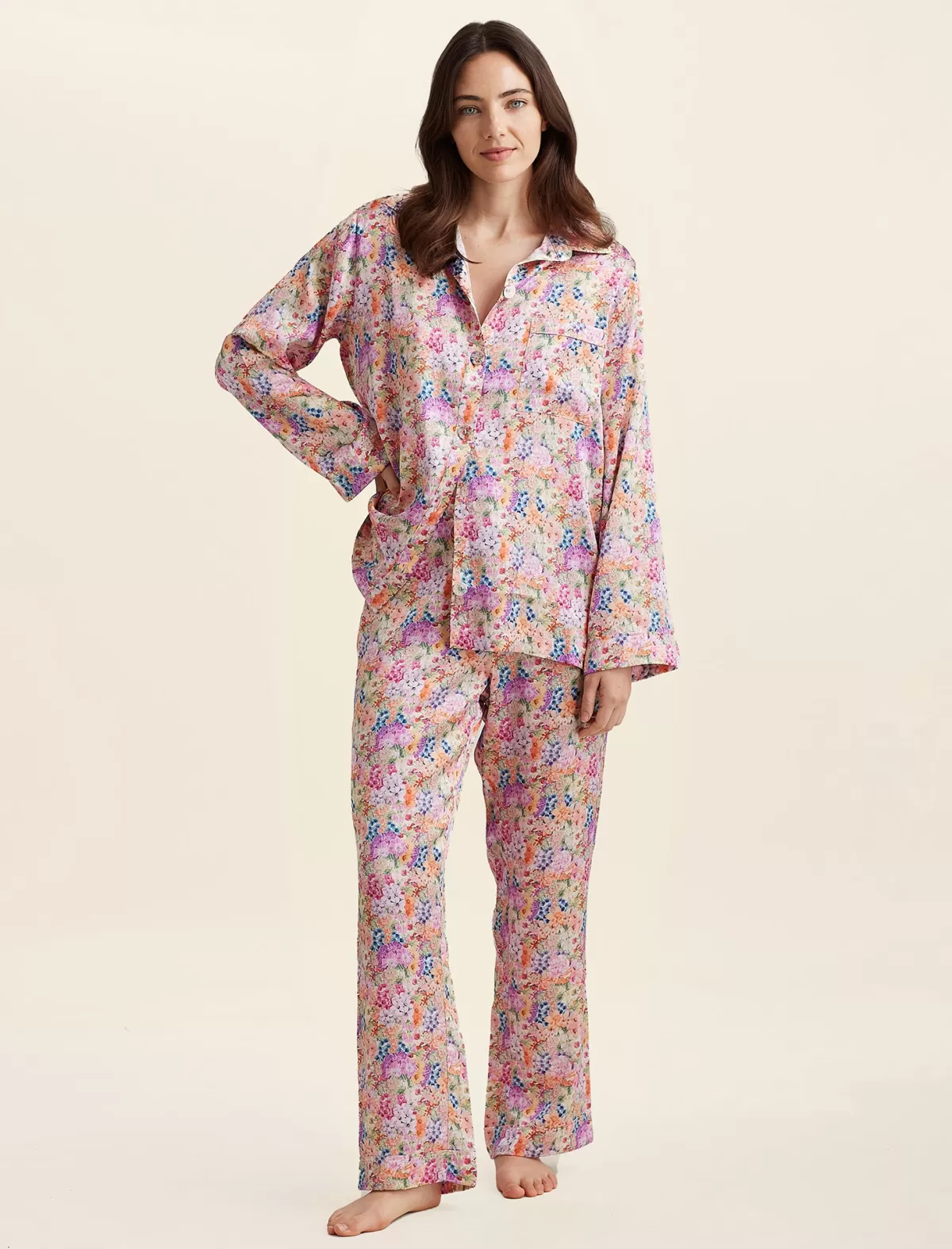 Indulge in a world of comfort and sophistication with this full-length pajama set, complete with an included eye mask, both beautifully adorned in a vibrant floral print, and crafted from 100% luxurious Belgravia Silk for the ultimate sleep experience.
