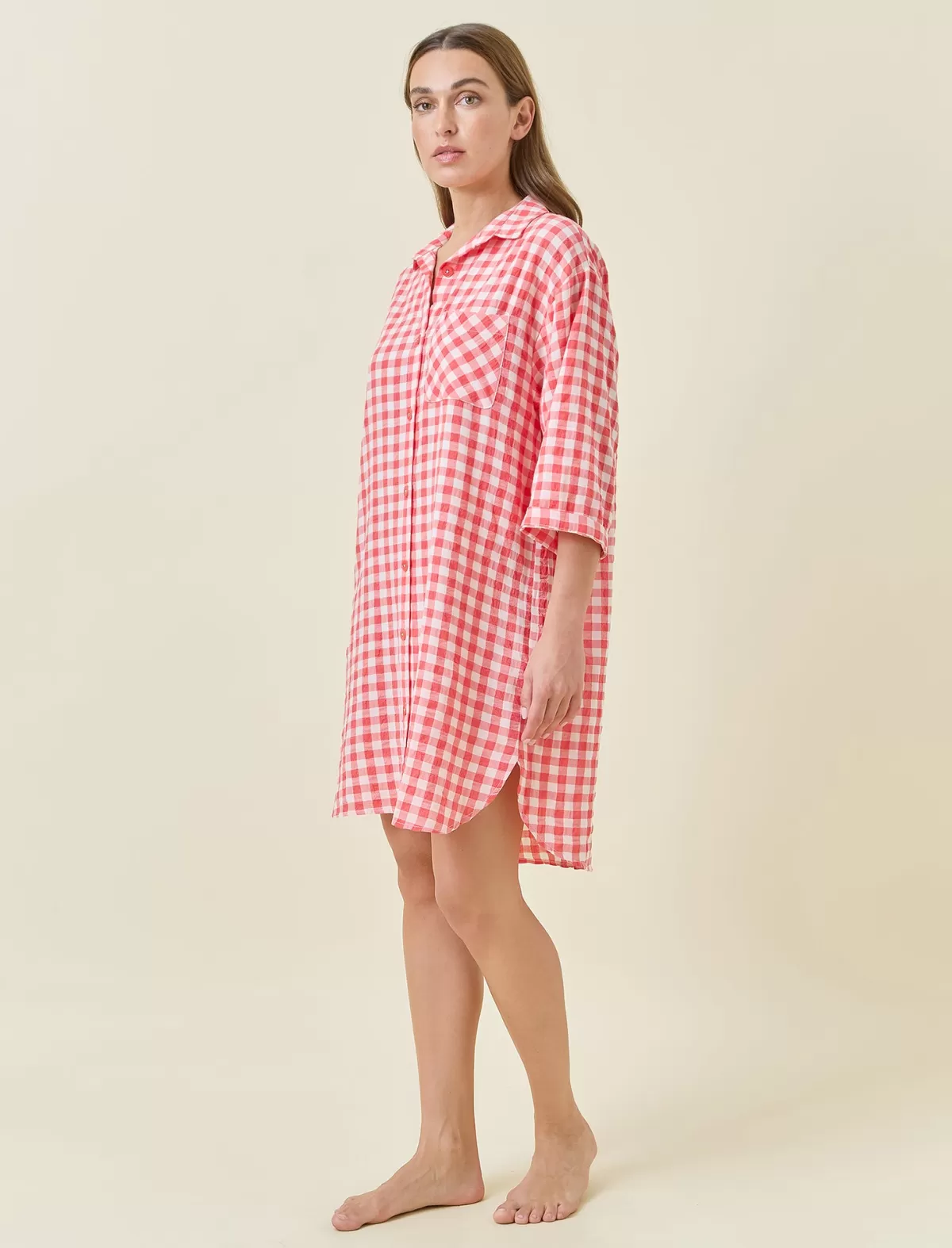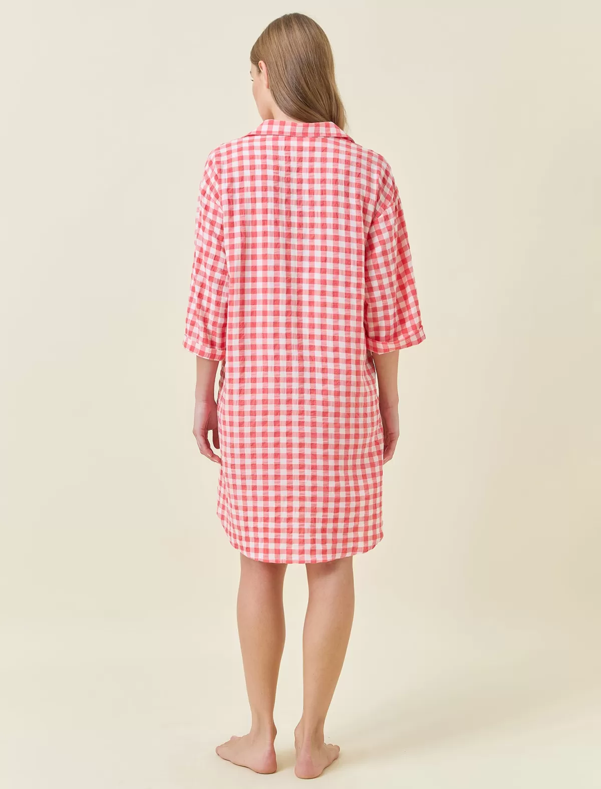 This classic seersucker gingham nightshirt is the perfect relaxed fit to throw on for lounging or sleep. The lightweight and soft material creates a perfect drape off the body and is perfect for the warmer months.