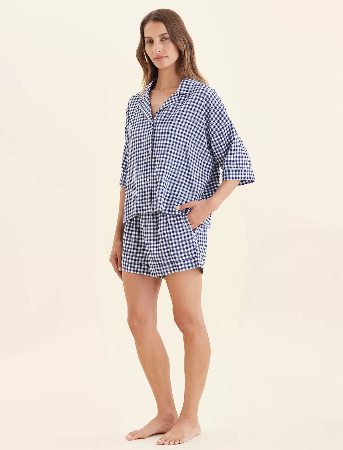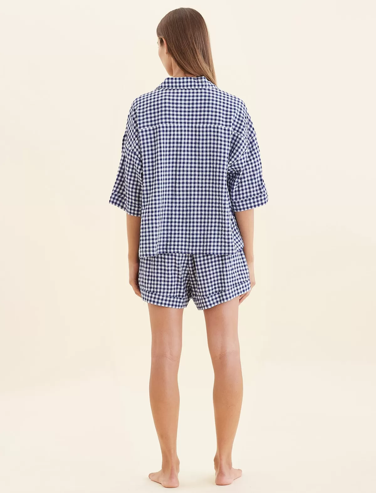This classic seersucker gingham shirt is made from a blend of Cotton and certified Lenzing™ Ecovero™ Viscose. The lightweight and soft material creates a perfect drape off the body and is perfect for the warmer months.